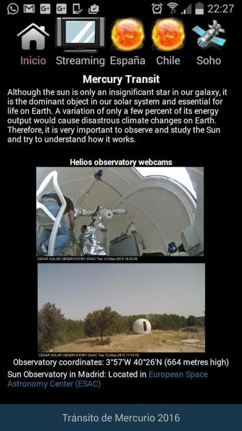 Простой инструмент, чтобы увидеть солнце непосредственно во время предыдущих наблюдений в пути и во время транзита Меркурия, который состоится 9 мая 2016 года Кроме того, вы можете получить доступ к живой поток с Европейским космическим агентством, где мы будем иметь последние миссии ЕКА, информационно-образовательный проект CESAR станции в Испании агентства ESAC.
