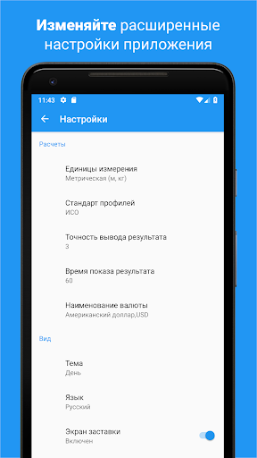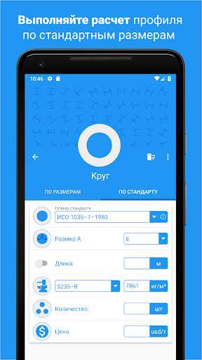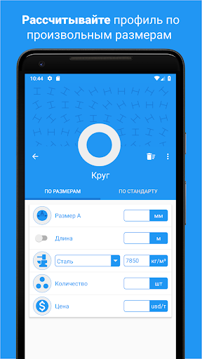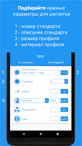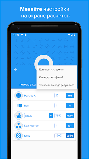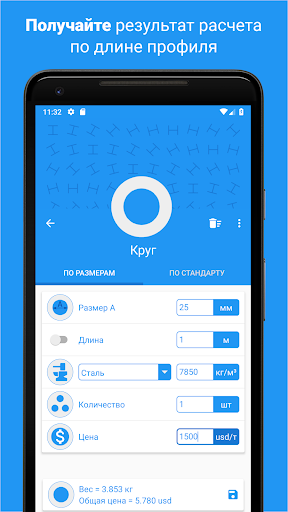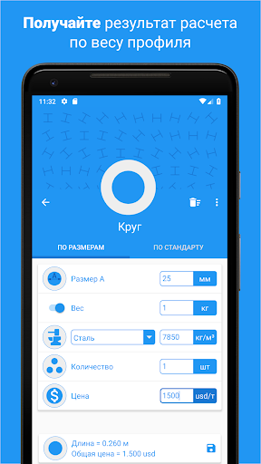 Расчет металла ведется по двум системам счисления : метрическая(кг,м), стандартная(lb,ft). Точность полученного результата устанавливается в настройках(от 0 до 10 знаков после запятой). Для определения цены металла назначается вид валюты(USD,GBP,EUR...) .