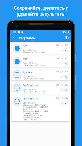 Результаты расчетов металлопроката можно сохранить в программе,поделиться результатами в социальных сетях facebook,skype,viber,sms.