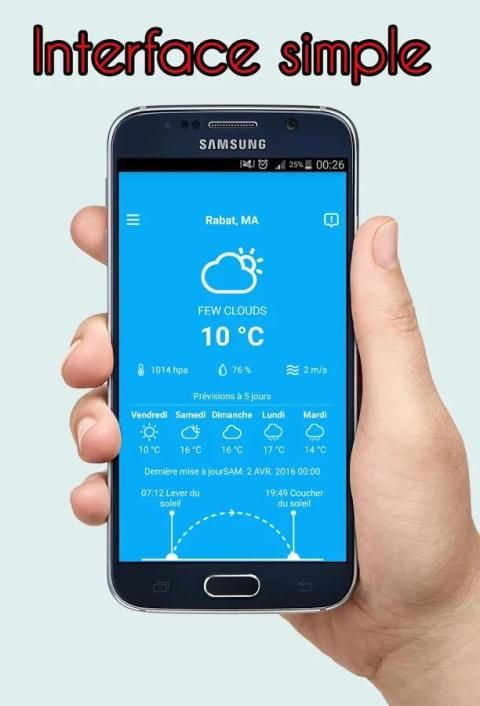 Метео Марокко является бесплатное мобильное приложение, которое при условии прогнозирования погоды погоды (время, ветер, влажность, приливы, риск дождя и состояние неба, календарь камбаловидной активности, оповещения) городов Марокко в течение пяти дней.