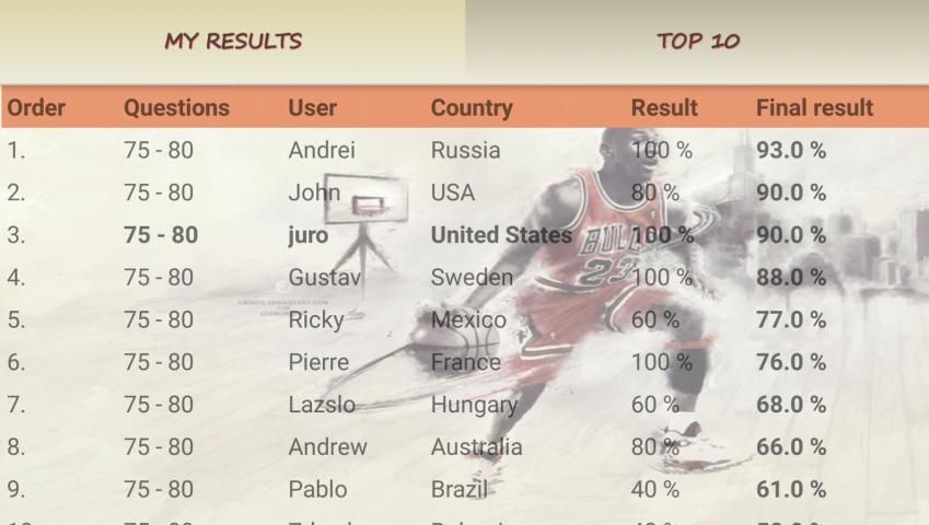 Счет - оценка раздел состоит из двух вкладок. Первая закладка отображает результат твоего викторинах и второй вкладке Дисплей ТОП 10 результатов