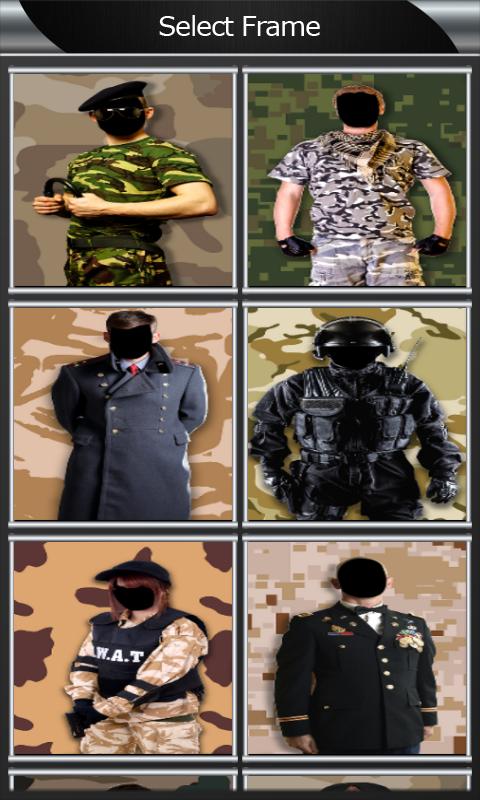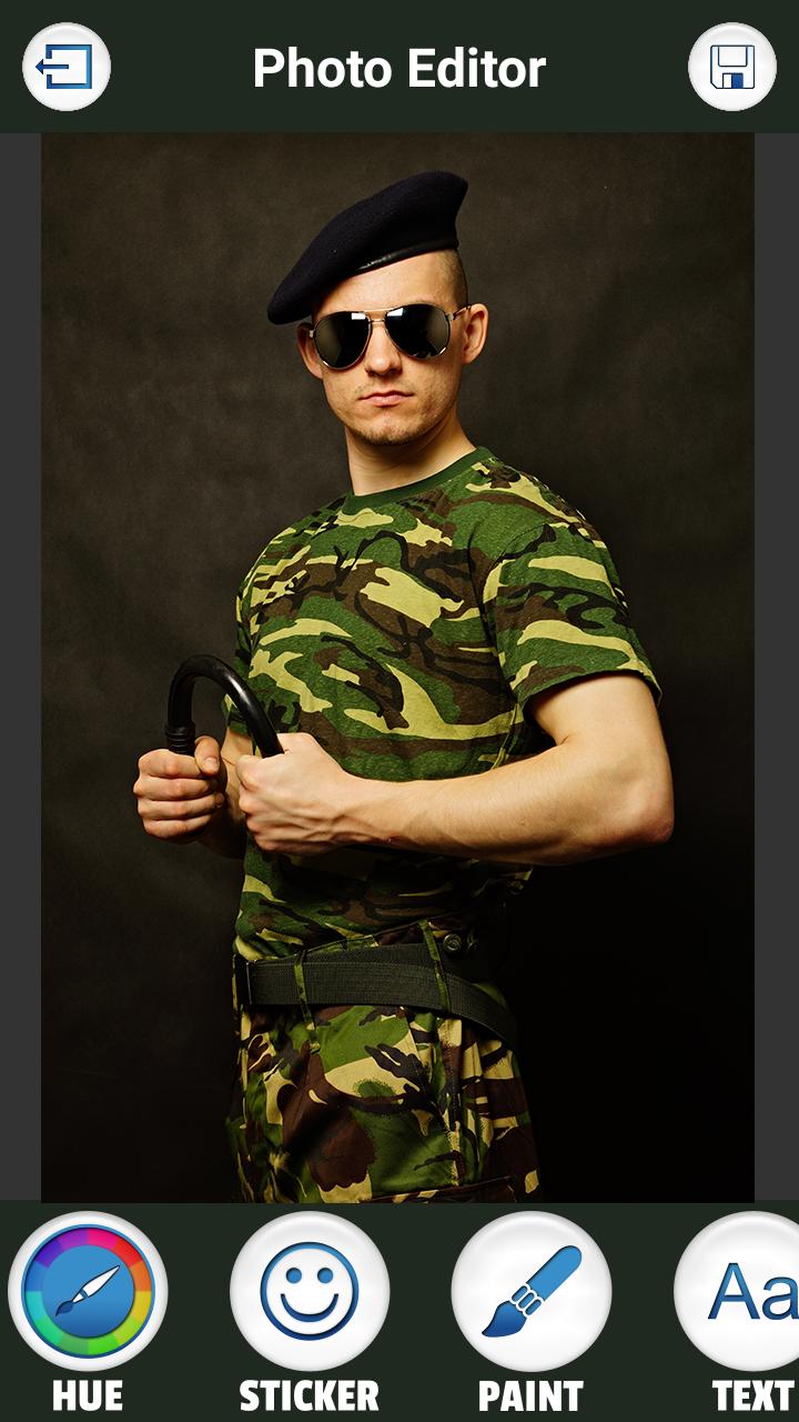 Open your new virtual wardrobe on smartphone, and enjoy changing the army suits. You will be surprised how this photo manipulation works easily, which makes you become a professional photo editor. Try cool camouflage costumes, then handsome and elegant military officer suits, captain’s uniform, army chief powerful uniforms. Be a Colonel, a Marine, etc. Edit photos and makeover them with top photo effects. With this best army police photo frame montage you will look powerful and strong. This is cool photo montage app. Enjoy this very funny photo montage app. Montage photo in cool military suit, with all equipment, like hat, weapon, gun etc. Take a photo or a selfie and adjust your face to fit perfectly the policeman photo suit and save it to your phone. This photo montage allows you to have best military dresses and equipment in just one keyboard click.Here you can wear and army chief powerful uniforms, and become brave soldier army personnel.