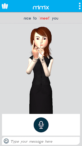 Mimix3D Language Translator - это мобильное приложение.что интерпретирует разговорный и написанный английский язык на язык жестов с использованием 3D-дружелюбного аватара, новые знаки добавляются каждую неделю, так что терпите нас.Переводы, позволяющие более простым общению с глухим & amp;Трудно слушать сообщество без необходимости знать язык жестов.Сделайте повседневное общение с глухим и трудным слышать сообщество более доступным.разговорные слова, поэтому глухой человек может писать текст, используя клавиатуру клавиатуры или языка жестов, которая затем говорит и подписывается одновременно.Словарь с более чем 7200 знаками из ASL, что делает его отличным инструментом для любого, кто изучает язык на своих телефонах.