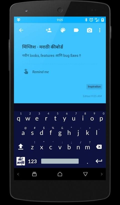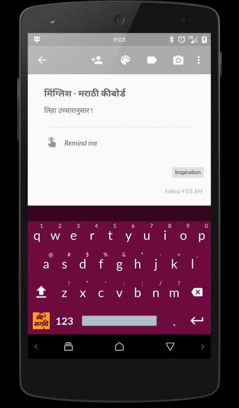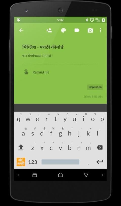 Minglish является простым в использовании транслитерации маратхи деванагари клавиатура со словарной поддержкой.