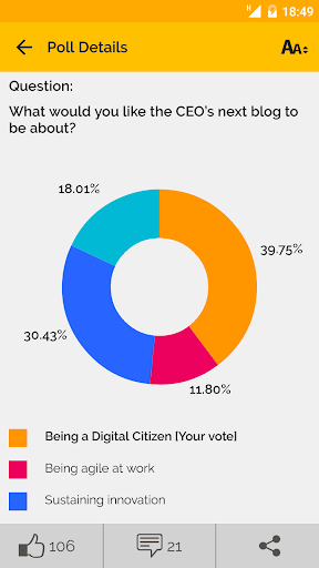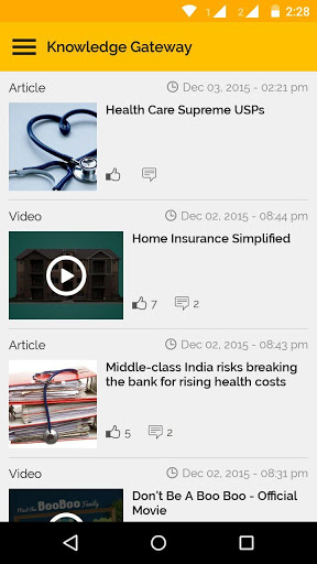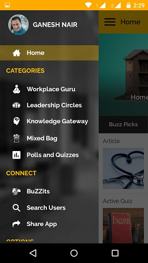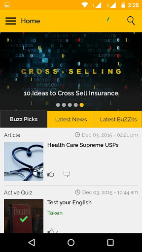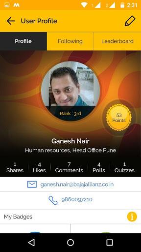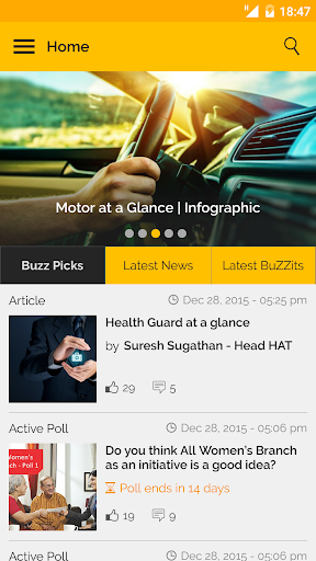 The app contains the following different types of content - Latest News, Articles, Images, Videos, Polls and Quizzes grouped in various categories. From the side menu, users can navigate to the different categories, view his profile and select available options. Users can read, view, like, comment, mark as favourite and share the different types of content to other employees in Bajaj Allianz and also participate in Polls and Quizzes. They can also share the app via SMS to employees who are not using the app. Search users option allows users to search for employees in Bajaj Allianz and view their profile. Favourites section displays all content that the user marks as favourite in the app. Downloads section displays the images and files downloaded by users from the app. "About MobiBuzz" gives information about MobiBuzz.