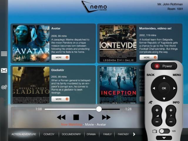 - Check the movies provided by the hotel with trailers and language options and control during watching on the hotel TV