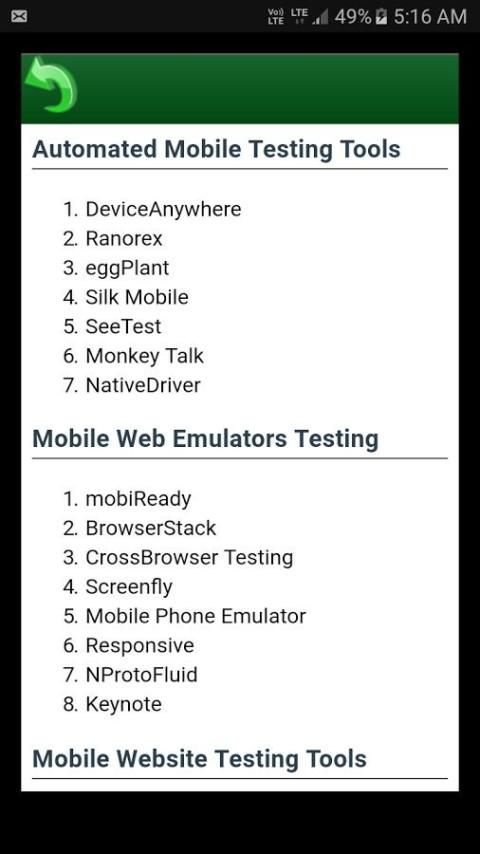 Данное приложение предоставляется на мобильный Советы Тестирование. Он содержит основные инструкции тестирования приложений, как пользовательский интерфейс, функциональные, эксплуатационные, прерывания, установка и юзабилити-тестирование.