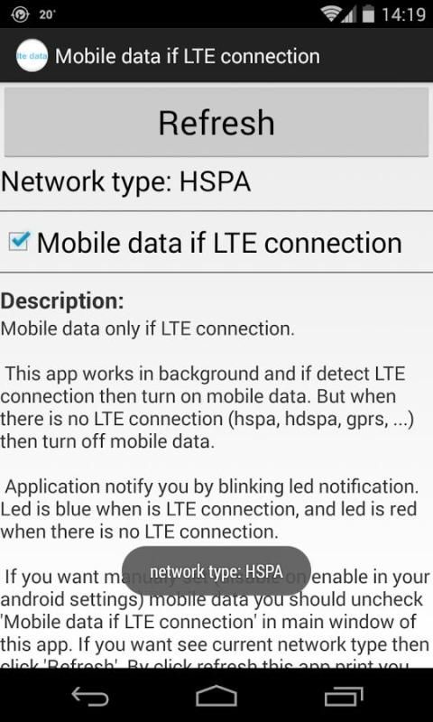 Если вы хотите Мануалы набор (запрет на возможность, в свой андроид настройках) мобильной передачи данных, вы должны снять галочку с мобильной передачи данных, если LTE подключение »в главном окне этого приложения. Если вы хотите увидеть текущий тип сети нажмите \ Обновить \