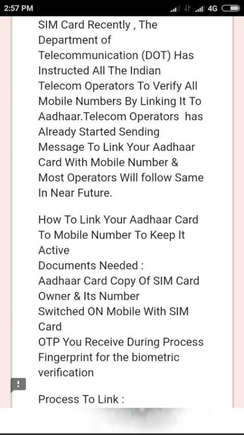 Aadhaar является обязательным Теперь для SIM-карты Недавно Департамент телекоммуникаций (DOT) проинструктировал Весь Индийские оператор связи проверить все мобильные номера, связывая ее с Aadhaar.Telecom Операторов уже начал отправлять сообщение связать свой Aadhaar карту с мобильным номером & Большинство операторы будут следовать тем же в ближайшем будущем.
