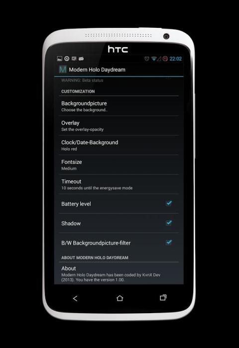 Это приложение Daydream для Андроид 4.2+ пользователей является удивительным. Он имеет хорошие анимации и большое меню настроек. Вы можете установить фон, цвета, FontSize и многое другое. Но самое лучшее, что есть, Daydream имеет режим energysafe. После концов тайм-аут (регулируемое) Daydream переключается на другой взгляд только с часами. Вы должны нажать на экране, чтобы получить главный вид обратно.