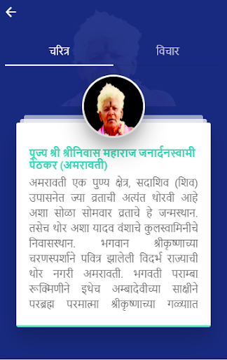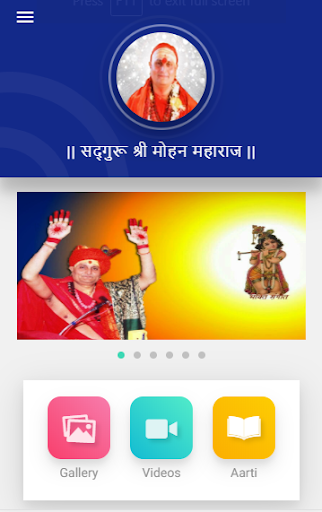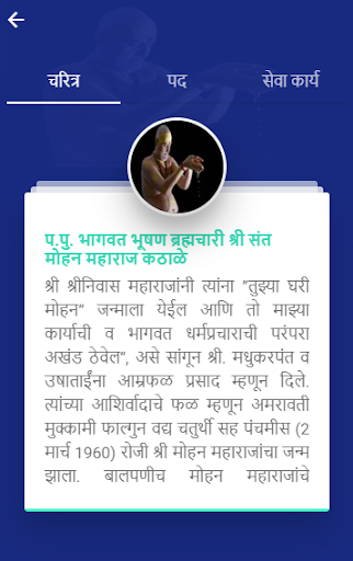 This app has Dashboard which has slider containing images. Sadhguru Shri Mohan Maharaj Bhagwat Katha, Images, Aarti. About 'Mohan Maharaj' and his Guru 'Shri Shrinivas Maharaj'