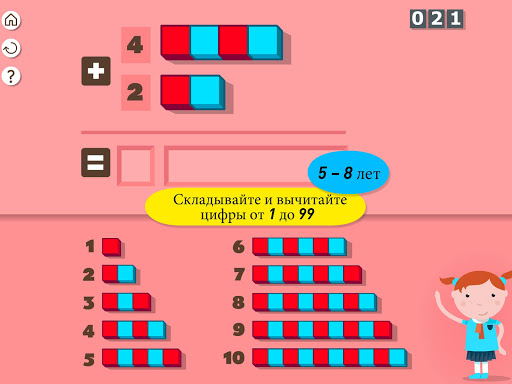 Это уникальное приложение полностью посвящённое простейшим вычислениям для детей в возрасте от 5 до 8 лет. Оно поможет вашему ребёнку в доступной игровой форме усвоить: