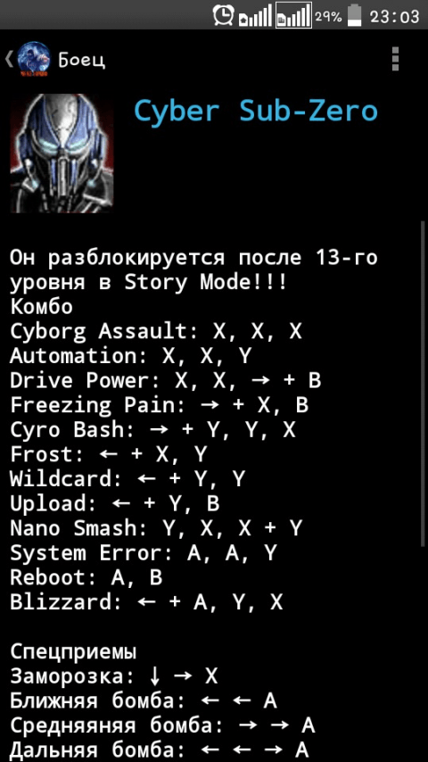 Справочник комбо-ударов для бойцов из Mortal Kombat Komplete Edition - Позволяет смотреть комбо в соответствии с вашей клавиатурой или геймпадом. - Включает комбо-удары, специальные приемы и фаталити для все персонажей