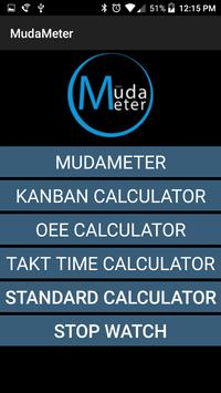 Features include MudaMeter, Kanban Calculator, Overall Equipment Effectiveness (OEE) Calculator, Takt Time Calculator, a standard stopwatch and a standard calculator.