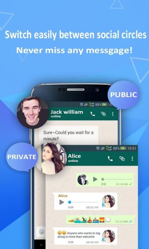 Новая концепция управления многостраничного счетов, освободить себя труд регистрации нескольких учетных записей на другом устройстве. Теперь у вас есть Privacy Space - Multi Account, не нужно, чтобы открыть ваш компьютер, ноутбук, IPad и ваш телефон в то же время только для регистрации в ваших нескольких учетных записей одного и того же приложения. Одно приложение, два счета, одно устройство!