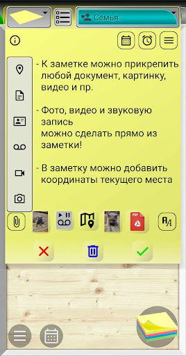 - Прикреплять к заметке любые файлы и документы и открывать их прямо из заметки.