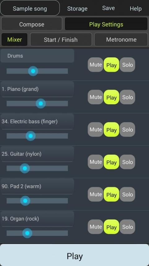 Звуки производятся с помощью MIDI-синтезатора вашего устройства, так что вы можете выбрать среди всех 128 инструментов, определенных стандартом General MIDI, которые включают в себя много типов гитар, бас-гитары, пианино, духовых, струнных, подушечки, синтезаторы, перкуссию, леса и некоторые эффекты.