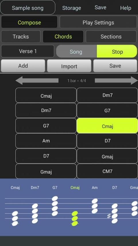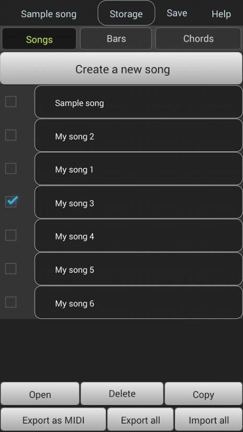 - Экспортировать все ваши песни, группы баров и аккордов во внешнюю память устройства, так что вы можете импортировать всю вашу библиотеку на другое устройство или сделать резервную копию вашей работы;