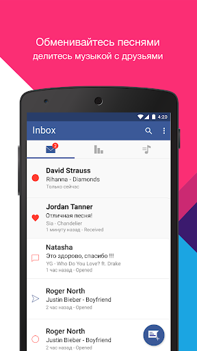 • Мгновенно отправлять песни и целые плейлисты друзьям и получать музыку от них