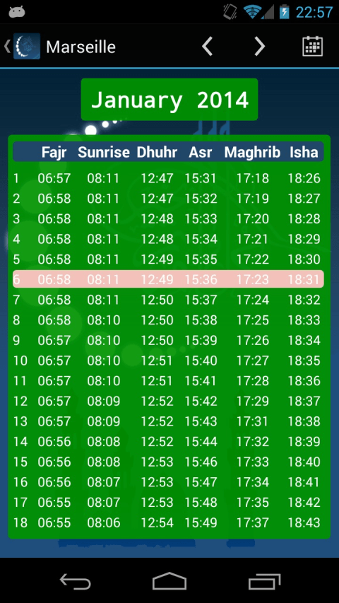 Salat Times gives you Muslim Salat Times for each city worldwide. It’s your ideal companion to keep track of muslim prayers wherever around the world. Salat Times displays following times : Fajr, Sunrise, Dhuhr, Asr, Maghrib and Isha. Prayers times calculation is entirely configurable with following parameters : * Calculation Method (Egypt, ISNA, Jafari, Karachi, Makkah, MWL, Tehran, UOIF) * Juristic Method (Hanafi, Shafii) * High Adjustment (Angle Based, Mid Night, One Seventh, None) * Time format (12-Hour format, 24-Hour format) * Daylight Saving Times (Auto, 0, 1) ============ /!\ WARNING /!\ ============ The setting of prayers times calculation parameters can make differences on hours of some prayers : * Change of Juristic Method will affect Asr prayer hour * Change of Calculation Method will affect Fajr and Isha prayers hours * Change of daylight saving times will affect prayers hours The settings of these parameters is available by clicking on the icon on bottom right on the action bar of home screen of application by choosing Settings. Other features =========== * Qibla Direction * Stores your favorite cities to know prayers times for these cities * Location of your current city via GPS * Month view to display prayers for a city for the current month or next months * Hijiri Date Format * Next prayer time is displayed in particular color * Enable notifications by prayers to be notified when time for prayer is now ! * Enable Adhan by prayers when time for prayer is now ! * 4x2 widget that displays prayers times for your current location that is detected thanks to GPS * Share prayers times for cities via SMS, mail or social networks thanks to a generated image of prayers times * Help menu explains you meanings of prayers times and the meanings of calculation parameters * Customize style of the application (text color of city and prayers names, text color of date, text color of next prayer). Localization ========= Salat Times supports English and French. If you want translate Salat Times to another language, don’t hesitate to contact me (salattimes@ssaurel.com). There is also a pro version of Salat Times with no ads that is a good way to help developer of the application. Salat Times purposes also a web site to access prayer times from your desktop computer : http://www.muslim-salattimes.com If you have feedback, bugs to submit (explain the bug by mail rather than send a bad comment which don't let me to fix it), or ideas to improve Salat Times, feel free to send me an email at salattimes@ssaurel.com