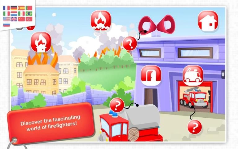 Тушить пожары и спасать жизни – вот дело для маленьких пожарных! Откройте для себяигру и веселитесь вместе со своими детьми вувлекательнейшем мире борцов с огнем в 4 режимах: кабинет начальника, гараж, пожар в деревне и пожар в городе!