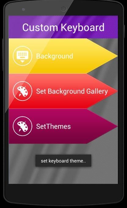 У вас есть более чем на 20 Тема клавиатуры, чтобы выбрать из для клавиатуры, и вы можете установить любой изображение, которое вы хотите в качестве клавиатуры фон, а ключ борды тема с несколькими языками.