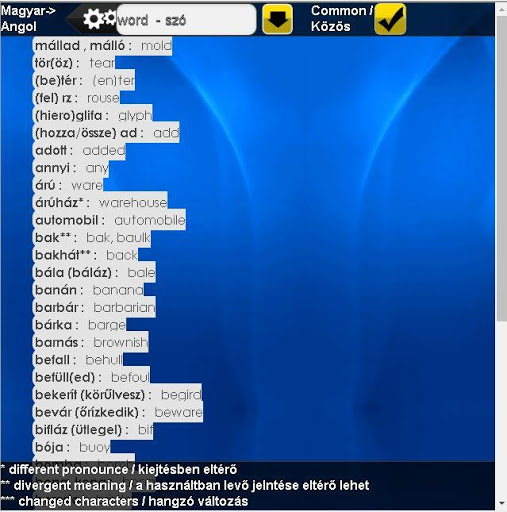 Hungarian-English dictionary with a collection of common words.