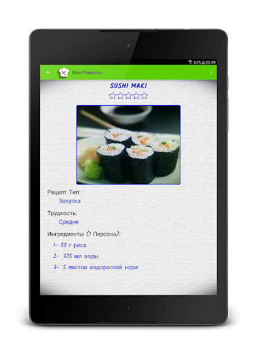 ● Вы можете проконсультироваться в любое время ваши рецепты, упорядоченные по типу, оценки или трудности и знаю, что готовить каждый день.