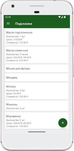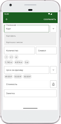 - Подсказки для быстрого набора: названия товаров, количества, цены и т.д.