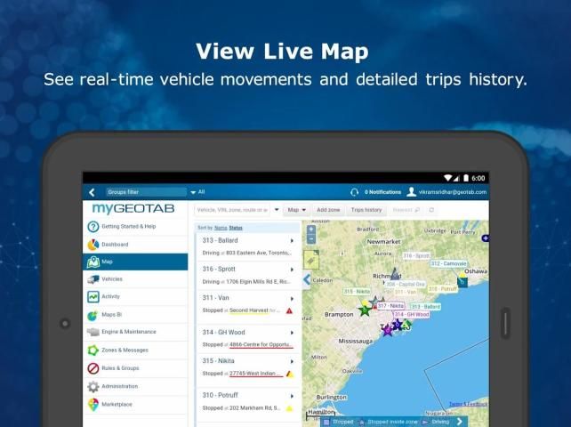 Получить всю важную информацию о ваших быстроходных транспортных средств и водителей с MyGeotab. Трек один автомобиль, или тысячи, прямо с вашего смартфона или планшета. MyGeotab ставит все свои характеристики и деятельности водителя автопарка у вас под рукой.