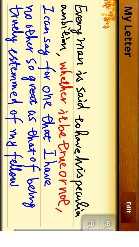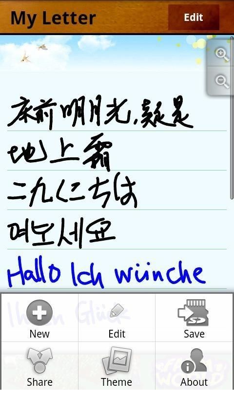 Use MyLetter to create handwriting letter, notes, MMS etc full of your personal style. v1.3.2 + pen color + bug fix + faster input v1.3.1 + delete letter by long click title in note list. ==== * Landscape and portrait edit * Automatic input * paper themes * Save letter to SD * Share via MMS, mail, Facebook * zoom in/out Recent changes: bug fix