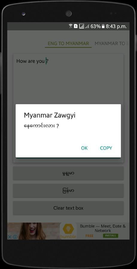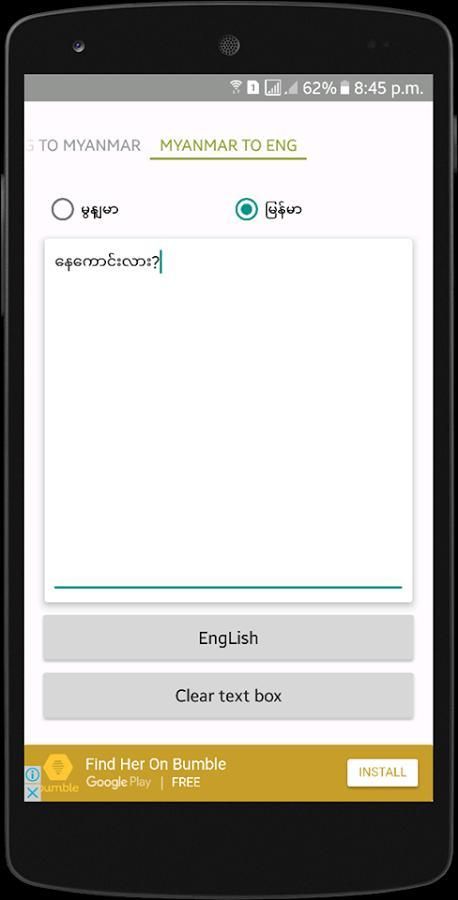 နွစ္ မ် ိဳး လံုး အ တြက္ နွစ္ ဘာသာ အျ ပန္ အ လွန္ ဘာသာ ျ ပန္ ဆို နိုင္ တ့ ဲ MyanmarEnglishTranslator ေလး ကို တင္ ေပး လိုက္ ပါ တယ္.
