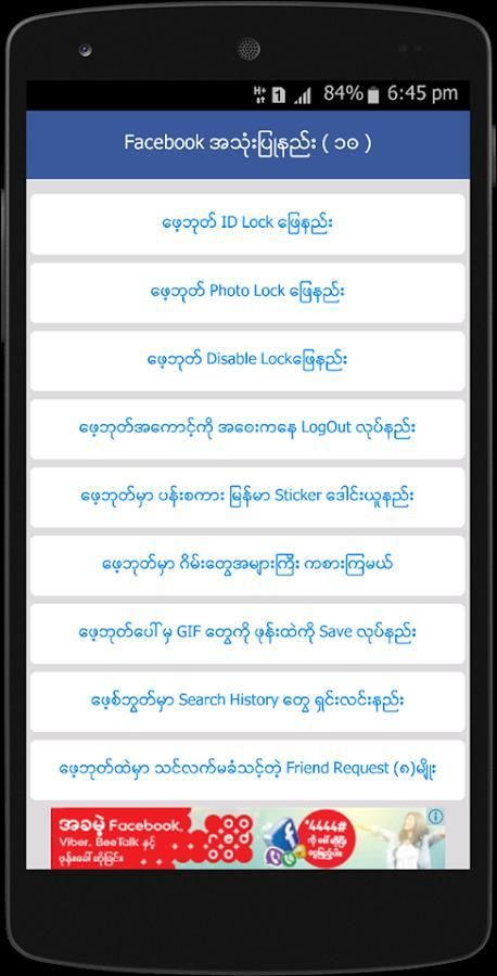Facebook အ သံုး ျ ပဳ နည္း မ် ားကို အေ သး စိတ္ ေလ့ လာခ် င ္ သူမ် ား ေဆာင္ ထား နိုင္ ပါ သည္. အ သံုး ျ ပဳ နည္း ေပါင္း (100) ေက် ာ ္ ေလ့ လာ နိုင္ ပါ တယ္. Facebook ကို က် ြ မ ္ း က် ြ မ ္ း က် င ္က ် င ္ အ သံုး ျ ပဳ နိုင္ ၾ က ပါေ စ.