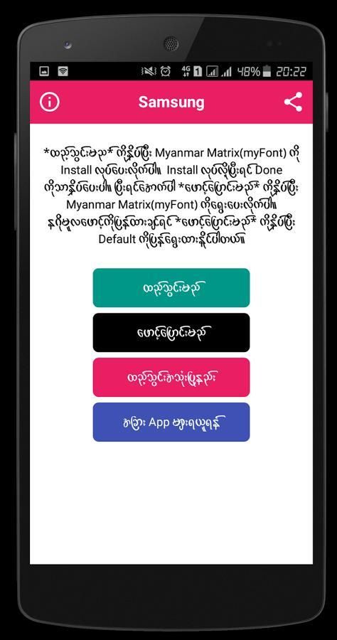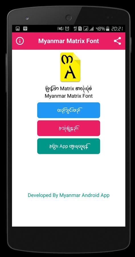 Browse and download apps to your android phone from the App Store. 20,000+ users downloaded Myanmar Matrix Font latest version on 9Apps for free every week! The app can be the quickest one to play if you get used to it. This hot app was released on 2017-06-04. If you want it so go head and download it and enjoy your app.
