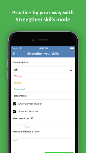 - Новые вопросы каждый раз: держать вас сосредоточены, мы рандомилизировать вопросы и ответы Каждый раз, когда вы начинаете тест на практику.