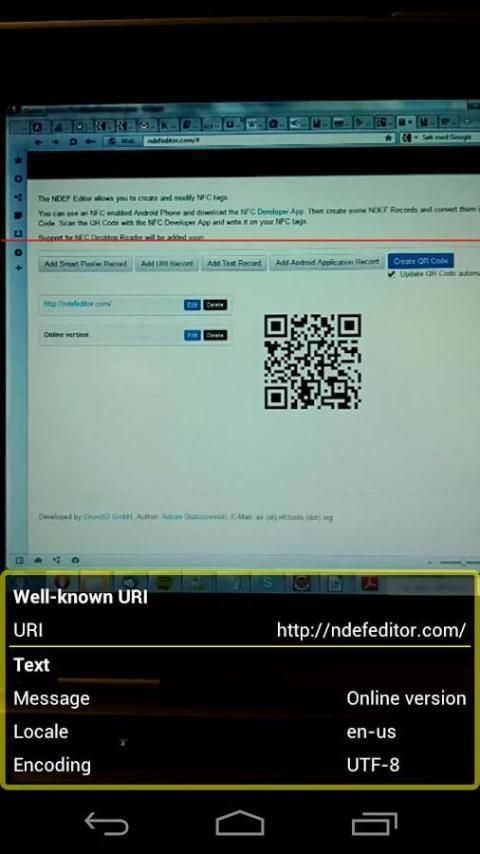 После того, как ваше сообщение NFC состоит, редактор автоматически генерирует двоичный QR код - отсканированные этим приложением. Тогда просто подправить в NFC тег писать - не может быть более простым.
