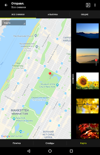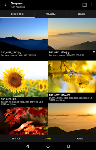 - Переключайтесь между тремя видами (Плитка/Слайды/Карта), чтобы получать удовольствие от просмотра снимков в форме, подходящей для Ваших предпочтений.