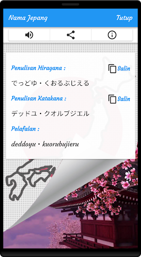 merupakan aplikasi yang berfungsi untuk mengkonversi nama kita ke dalam tulisan atau karakter jepang, baik itu hiragana maupun katakana, selain mengkonvert, aplikasi nama jepang ini juga memiliki fitur membaca hasil konversi nama jepang kita dalam bahasa jepang.