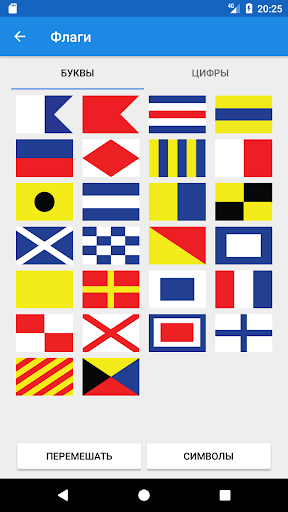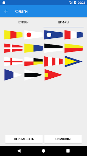 Вы узнаете, численные и буквенные флаги. Каждая карточка дополнительно содержит семафорные знаки и коды азбуки Морзе. Также Вы всегда можете пройти тест и увидеть свой прогресс. Наслаждайтесь.