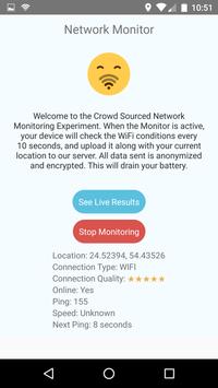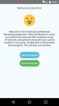 Welcome to the Crowd Sourced Network Monitoring. When the Monitor is active, your device will check the WiFi conditions every 10 seconds, and upload it along with your current location to our server. All data sent is anonymized and encrypted. This will drain your battery.