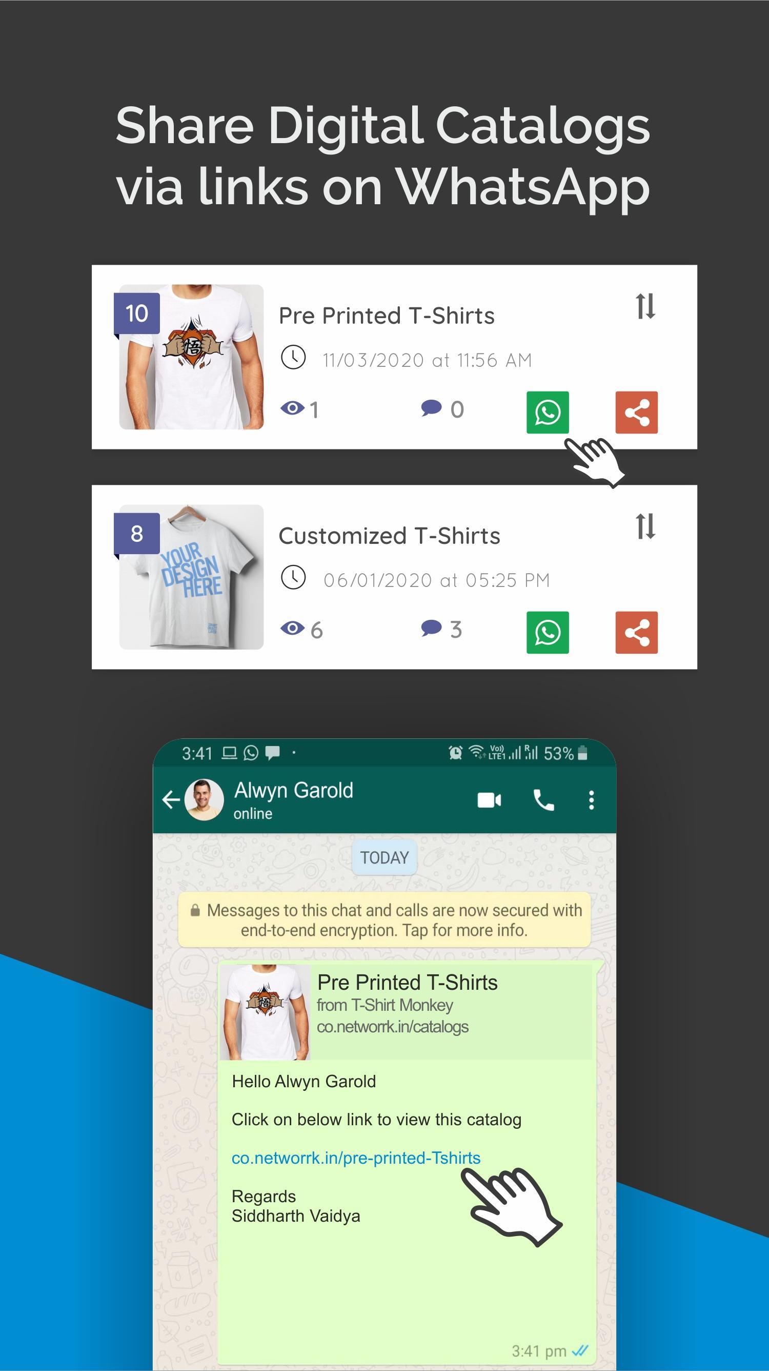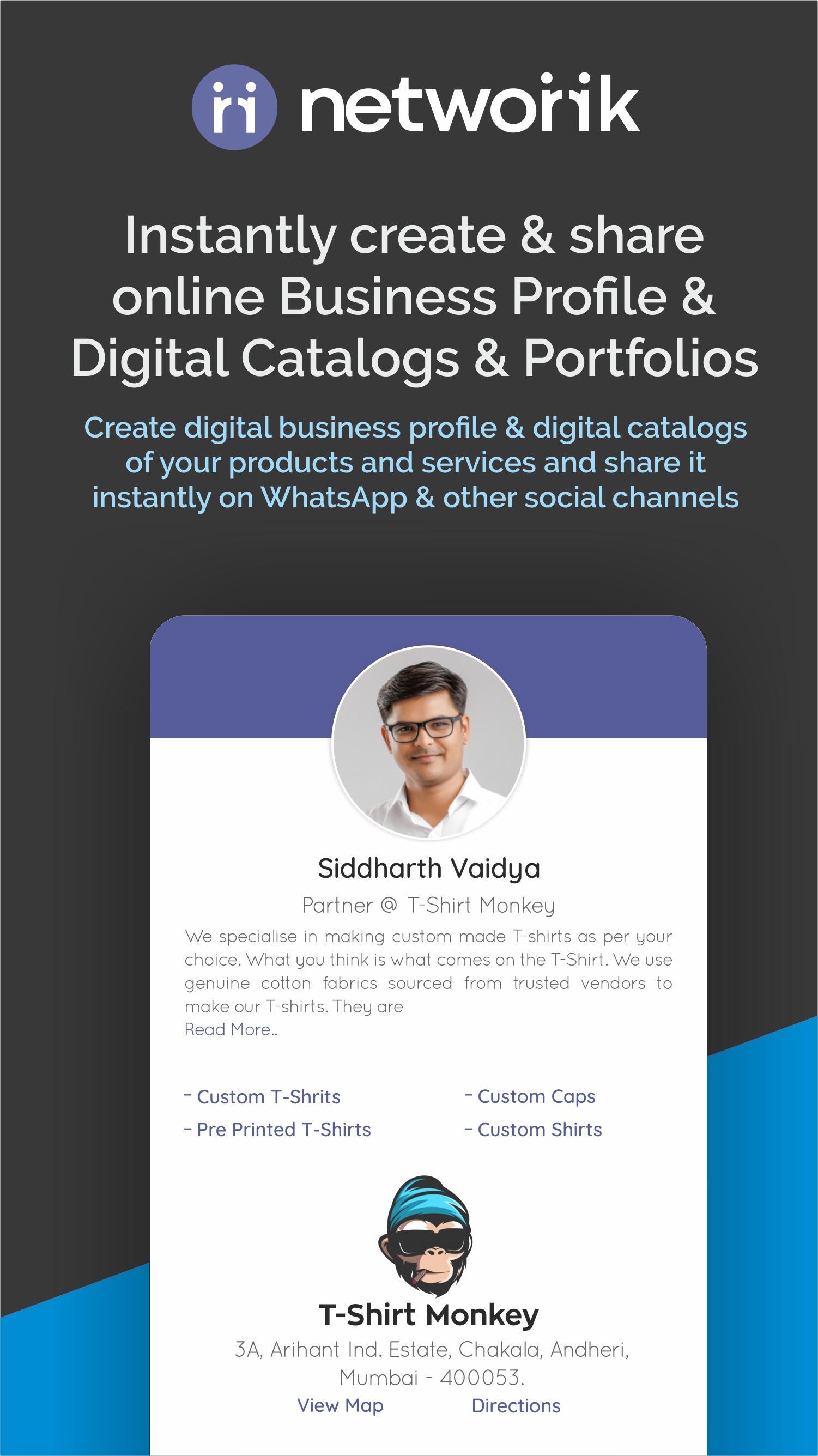 Networrk app allows you to create a professional business presence along with a digital catalog and a product portfolio that you can share seamlessly with your prospects or clients via WhatsApp, Facebook Messenger, SMS, email or on any other social media channels.