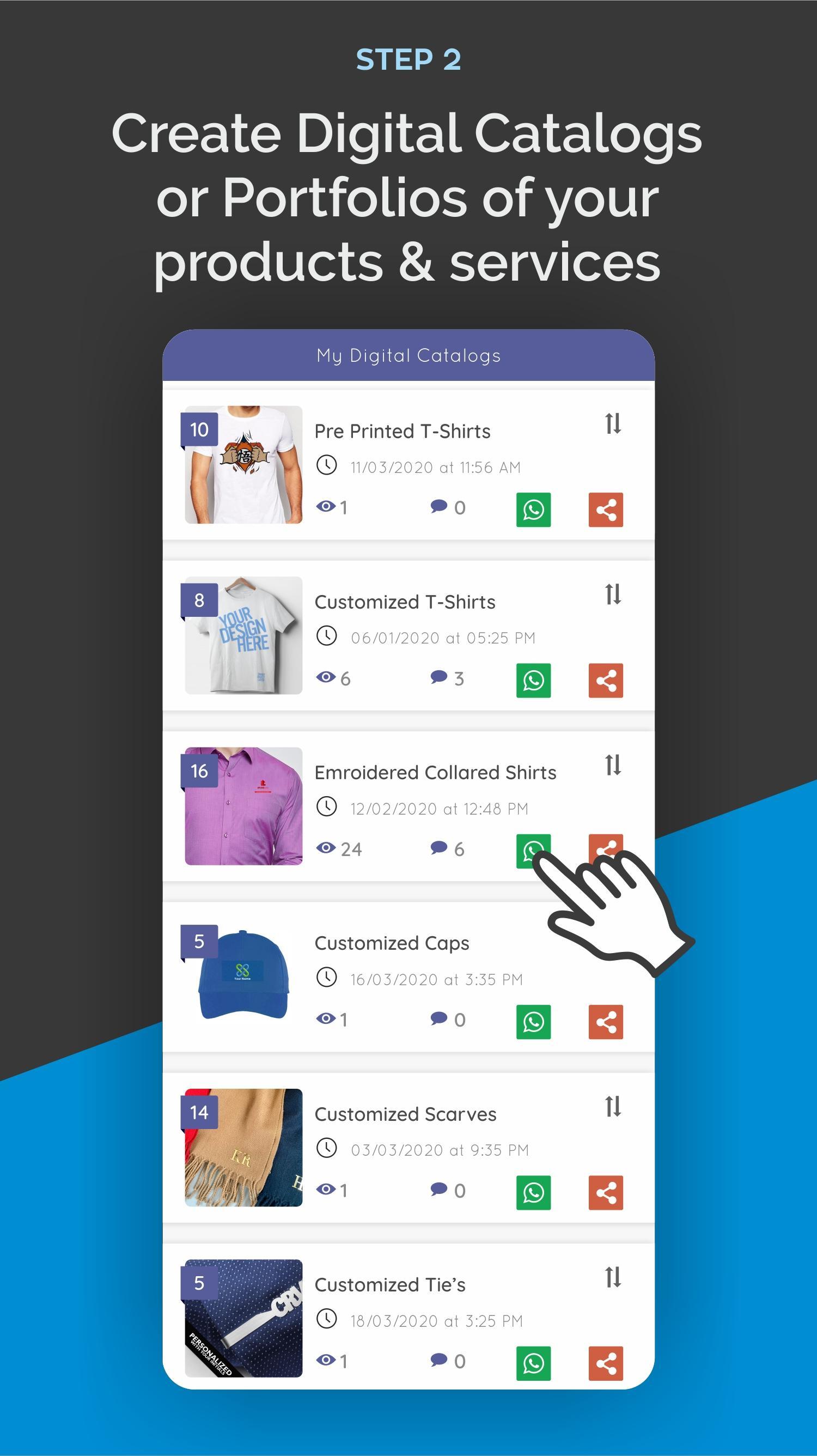 Your products and catalogs are designed and stored in such a way that you may never go to your mobile phone gallery to select a particular product or products to send to your prospects or clients via WhatsApp. Simply go to your catalog and share multiple products or catalogs that are systematically arranged for you via a single web link to your clients along with their descriptions. This will help you clutter-free image sharing on WhatsApp.
