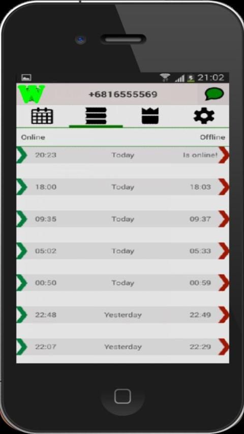 Момент, когда вы начинаете использовать этот-анкету. Каландр будет создан для вас увидеть satatistics, вызванных контактом прослежена. Таким образом, вы будете иметь возможность знать, как долго ваш контакт он-лайн в течение последних 24 часов, на прошлой неделе, или за последние 30 дней.