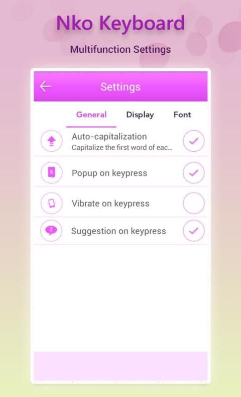 Настройка параметров, используемых для применения параметров в вашем NKO клавиатуры с различными options.like Общие настройки, Настройки дисплея, настройки шрифта, настройки звука и т.д.