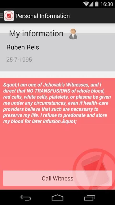 Программа, чтобы помочь Свидетелей Иеговы по чрезвычайным ситуациям. Это обеспечивает многократное информацию на устройстве, чтобы предупредить основателя его воли лечения, как с использованием крови.