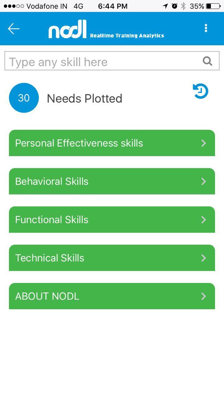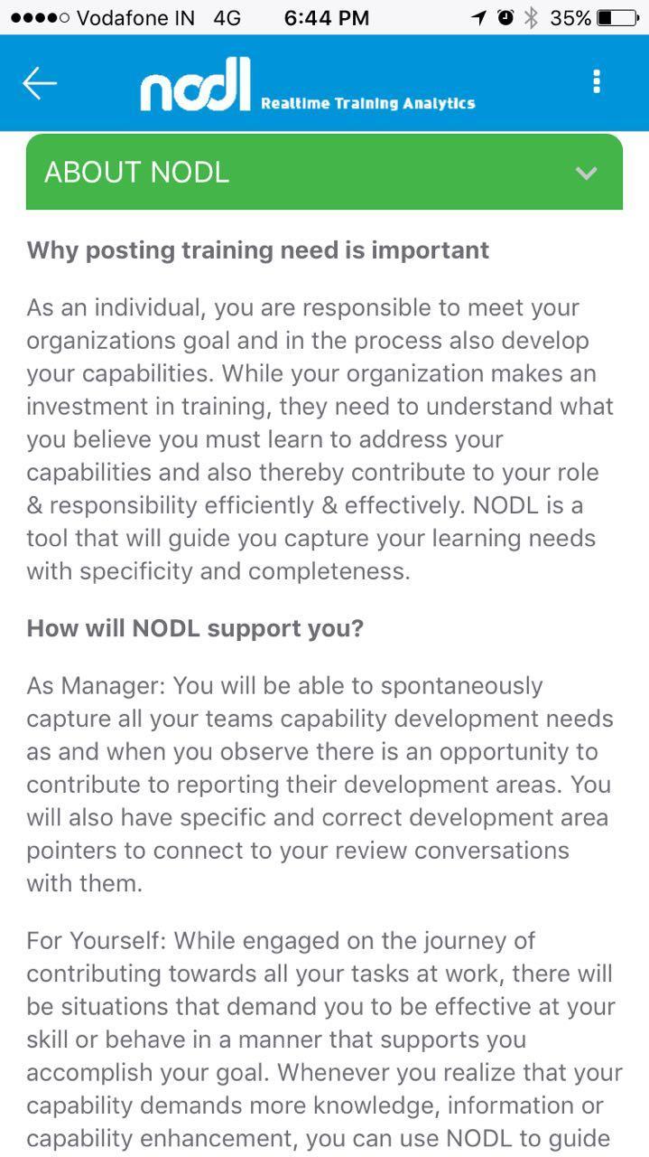 NODL, plugs the most critical issue of weak TNA information to HR/L&D, and offers employees to plot their training needs. It supports managers/leaders capture training needs of their reporting members and it offers HR/L&D a complete set of variable reports about all learning areas that people at work believe are needed to manage results and goals effectively. The system works online with a smartphone application for users, and has a web-panel for the administrator. Besides TNA information, the solution offers the administrator to make program or information announcements, and requests participants to share program feedback. It also requests participants to plot their learning diary to address post training effectiveness.
