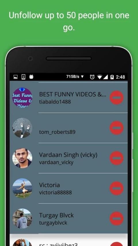 • Не Последователи: Найти пользователей, которым вы следуете, но которые не следуют вас обратно. И вы можете просто неследовать их из приложения.