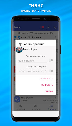 Добавляйте приложения в черный и белый списки, чтобы выбирать, кто может показывать вам уведомления, а чьи подождут своего времени в истории.