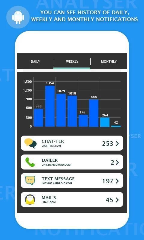 - приложение покажет вам статистику числа уведомлений, обслуживаемых каждое приложение. Вы можете проверить данные текущего дня или еженедельные и ежемесячные исторические данные.