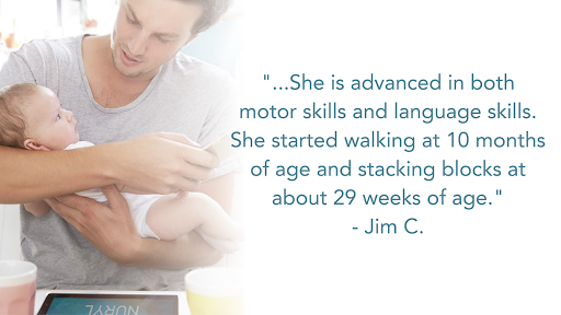 «Я могу сказать (и наш педиатр говорит) она продвигается как в моторных навыках, так и на навыках языка. Она начала ходить в 10 месяцев возраста и укладки блоков примерно за 29 недель. " - Джим С.